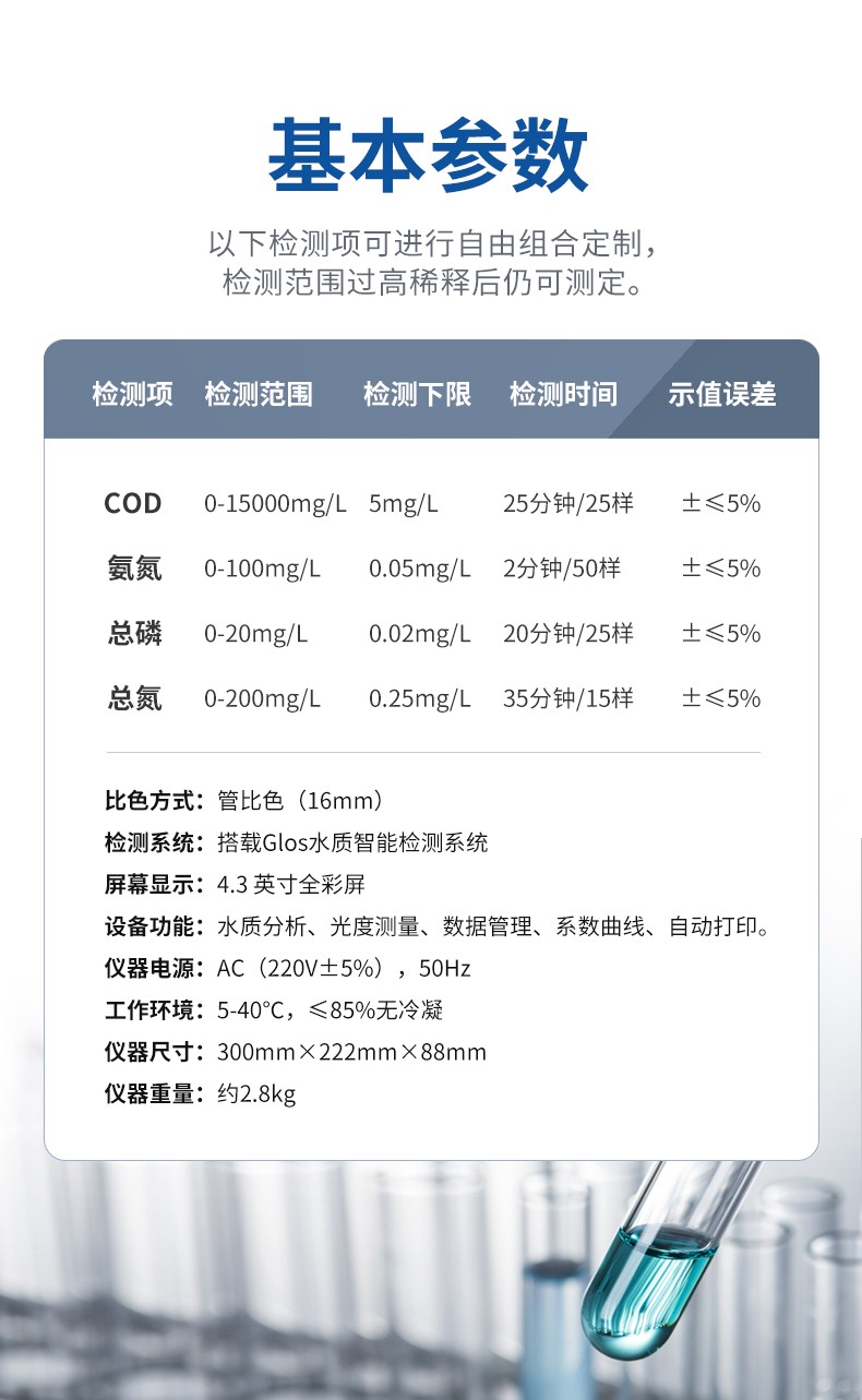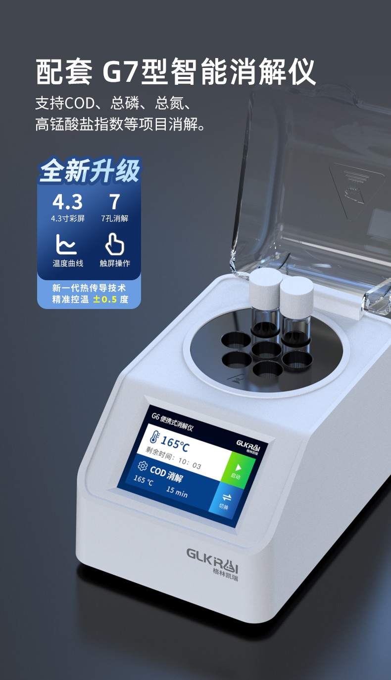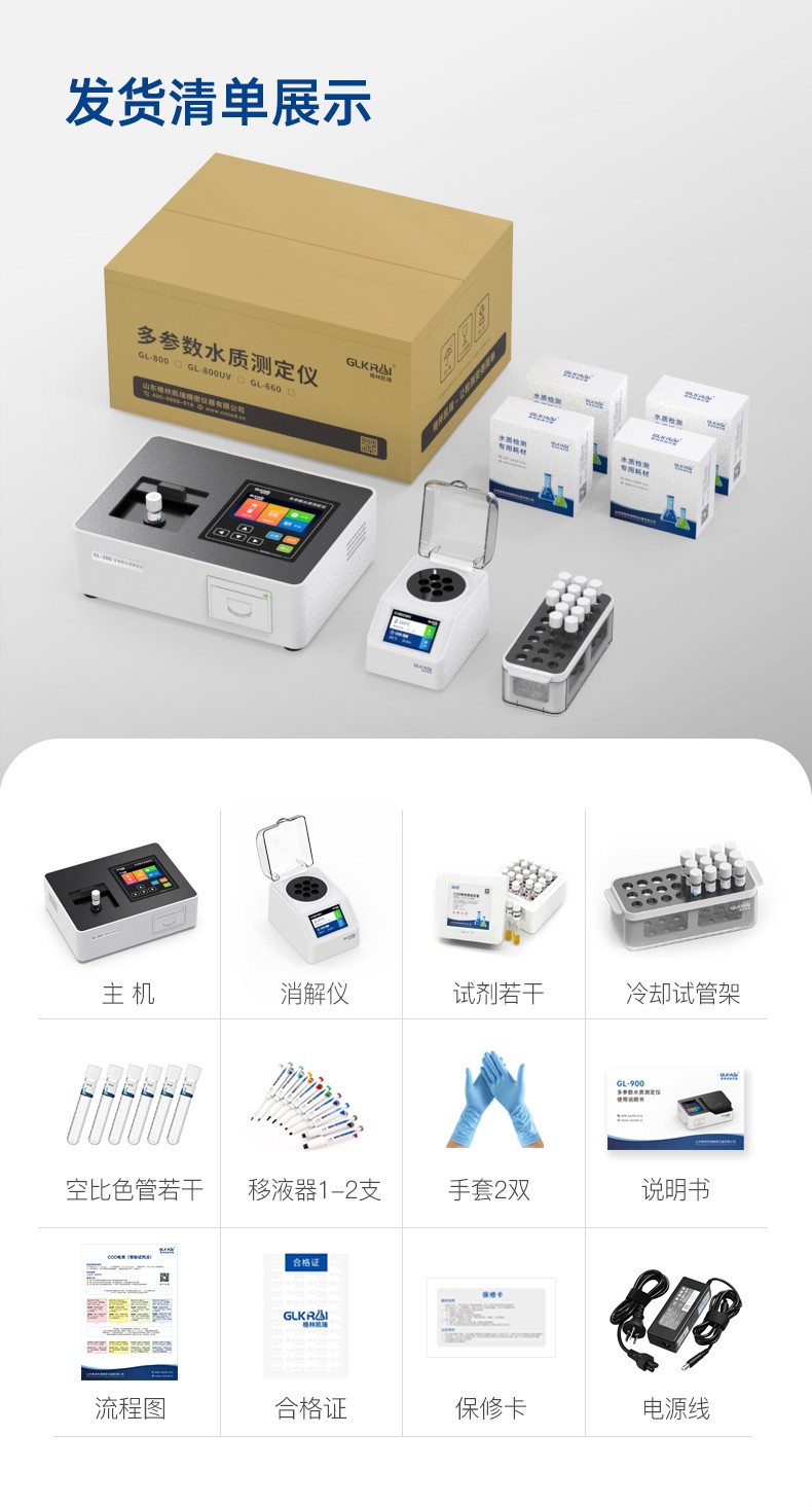 測定項目的原理符合環保行業認可方法。比色方式采用管比色,無需移液至比色皿便能快速測定水質中 COD、氨氮、總磷、總氮的濃度,內置微型熱敏打印機,檢測完畢即可打印數據,測試數據可通過U盤導出。設備搭載“Glos?質智能檢測系統”讓檢測變得簡單智能。