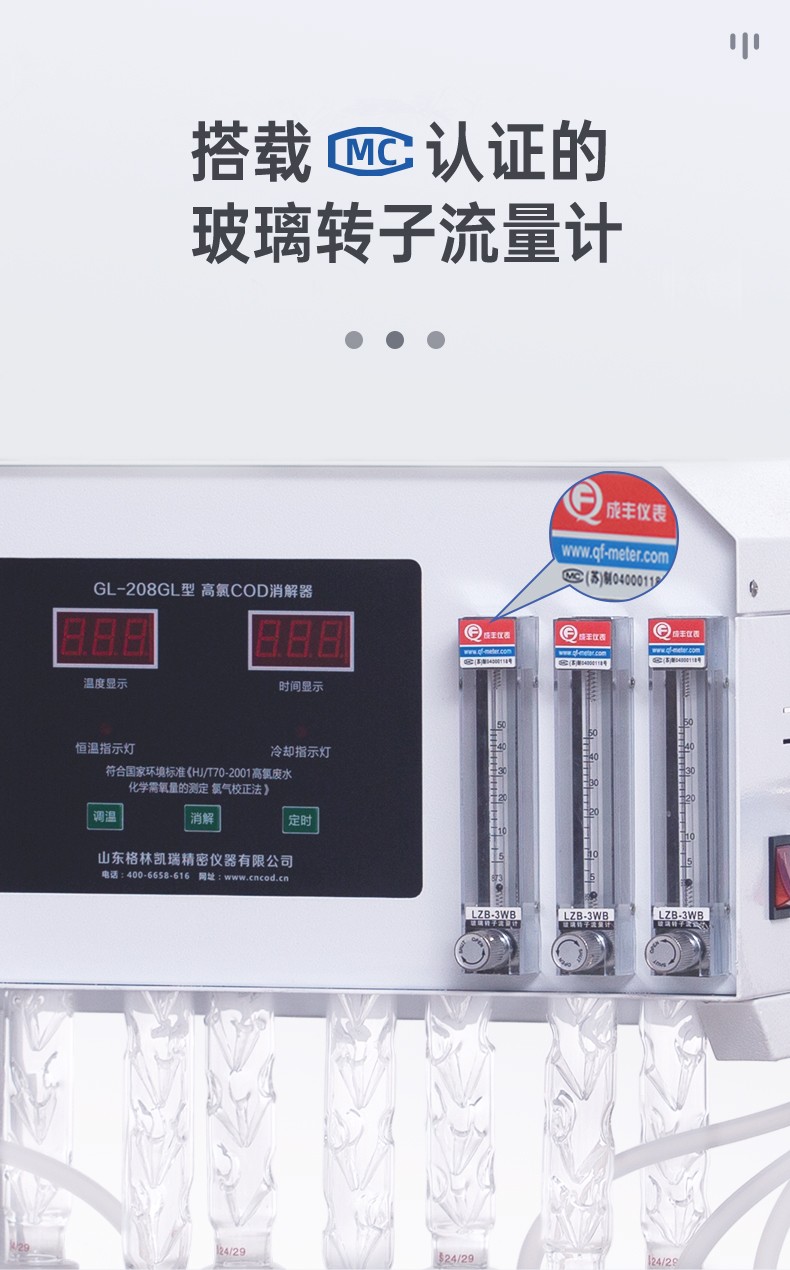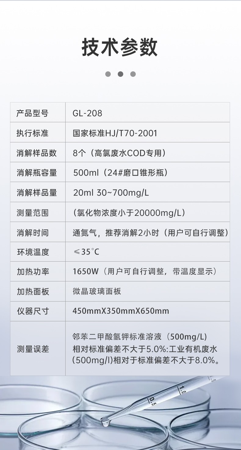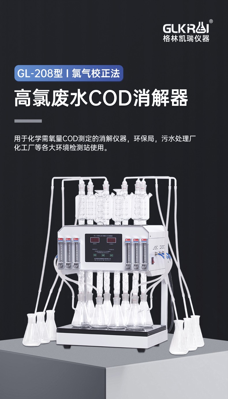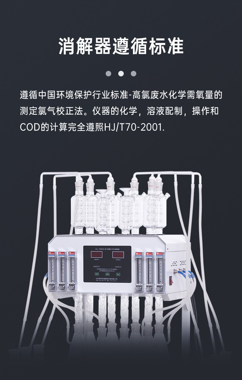 高氯COD消解器遵循國(guó)家標(biāo)準(zhǔn):高氯廢水化學(xué)需氧量的測(cè)定氯氣校正法,儀器的化學(xué)溶液配制、操作和COD的計(jì)算遵照 HJ/T70-2001,適用于氯離子含量小于20000mg/L的高氯廢水中COD的測(cè)定。