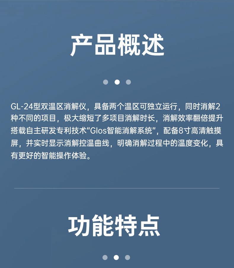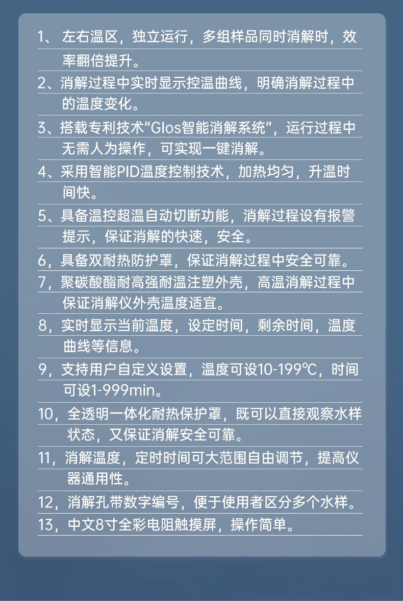 具備兩個(gè)溫區(qū)可獨(dú)立運(yùn)行,同時(shí)消解2種不同的項(xiàng)目,極大縮短了多項(xiàng)目消解時(shí)長(zhǎng),消解效率翻倍提升。搭載“Glos智能消解系統(tǒng)”,配備8寸高清觸摸屏,并實(shí)時(shí)顯示消解控溫曲線,明確消解過程中的溫度變化,具有更好的智能操作體驗(yàn)。