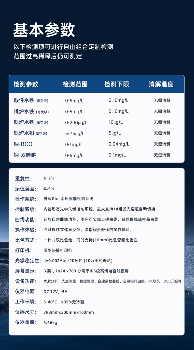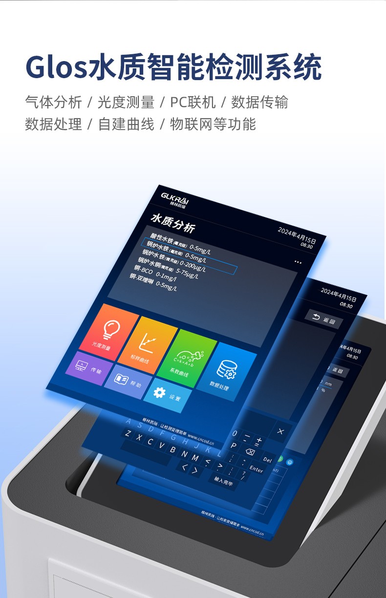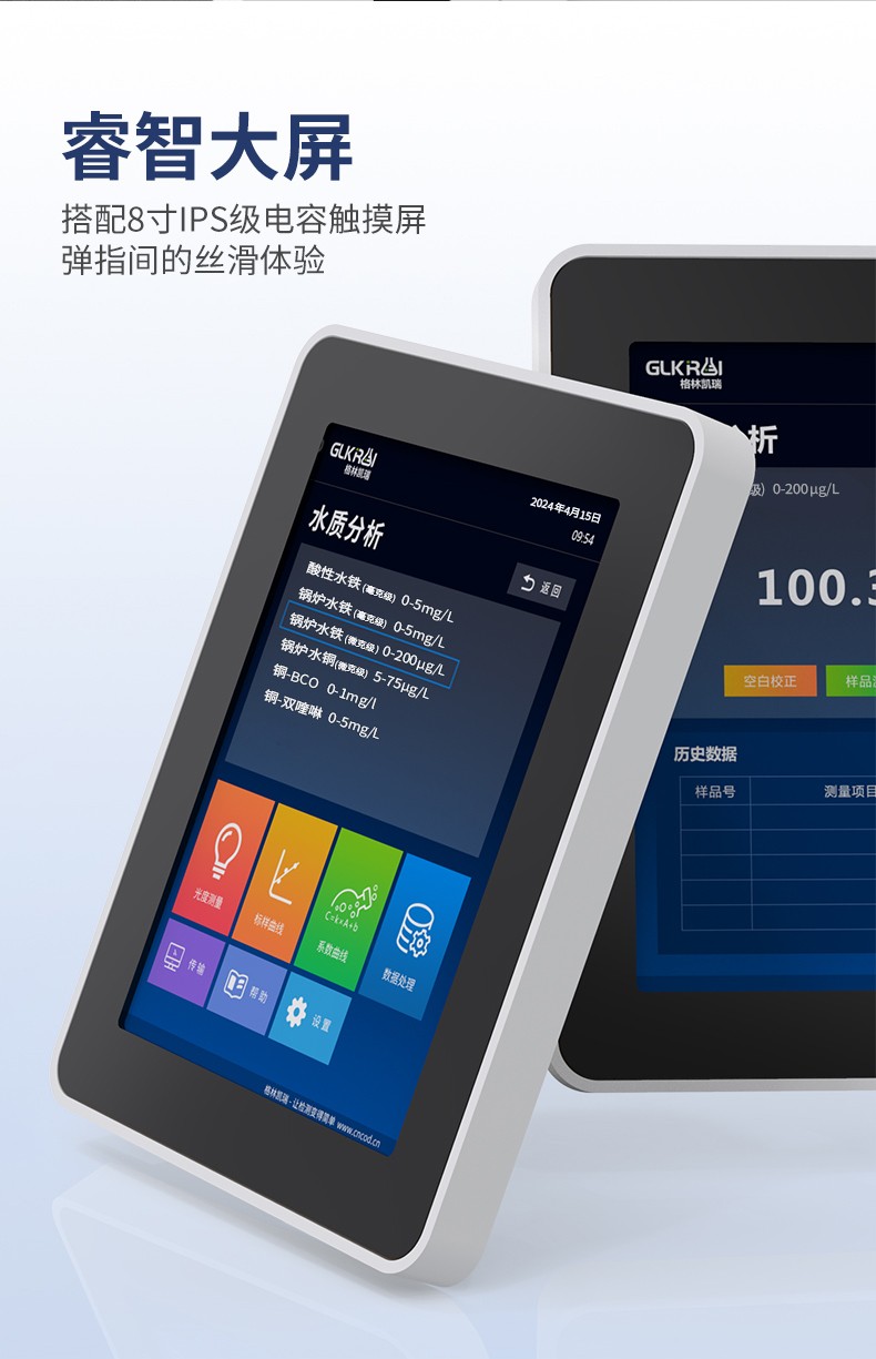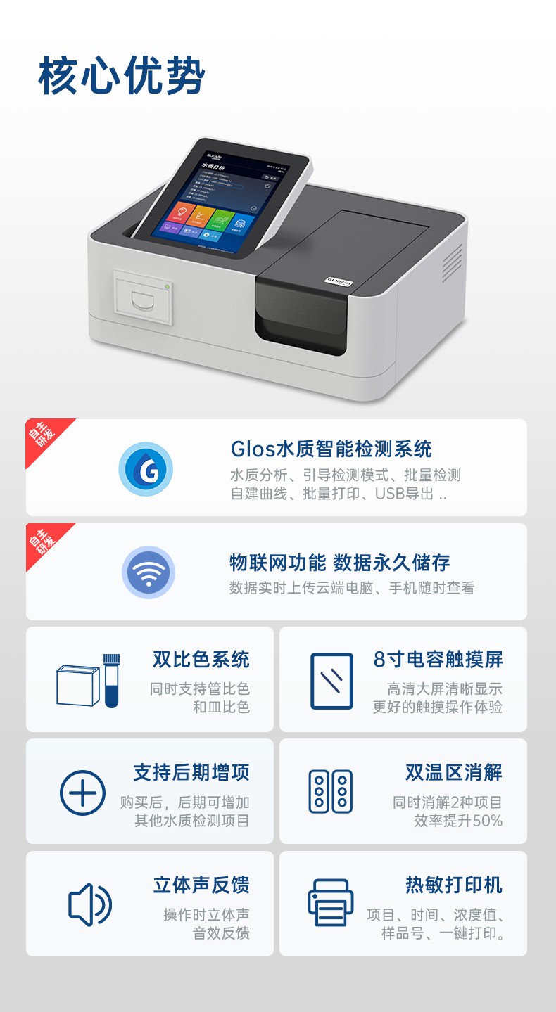 測定項目的原理符合環(huán)保行業(yè)認(rèn)可方法,設(shè)備的光源、傳感器為國外進(jìn)口,擁有更穩(wěn)定的光學(xué)性能,設(shè)備搭載自主研發(fā)的Glos水質(zhì)智能檢測系統(tǒng)和一體式雙比色池技術(shù),使檢測變得更簡單,更穩(wěn)定。