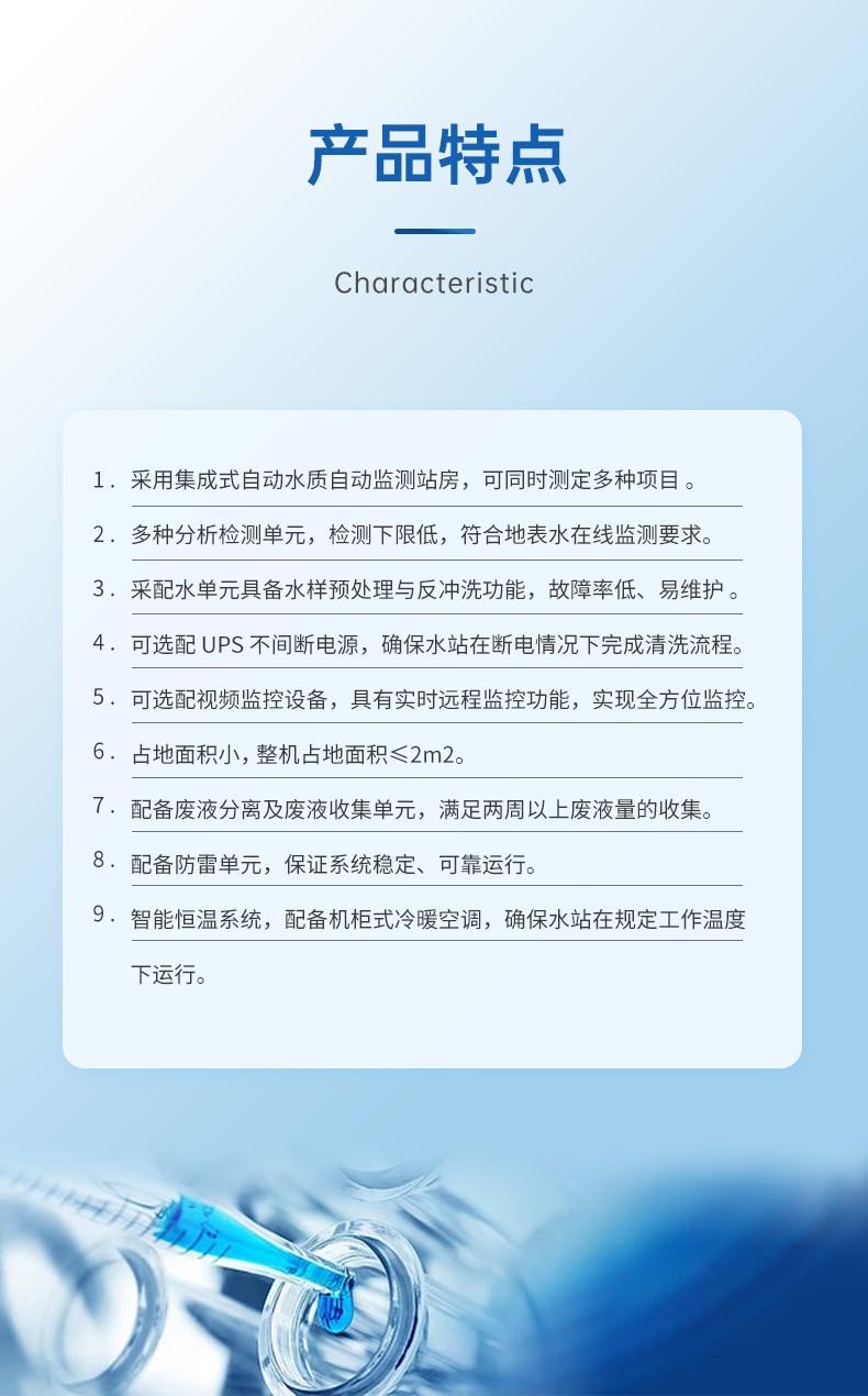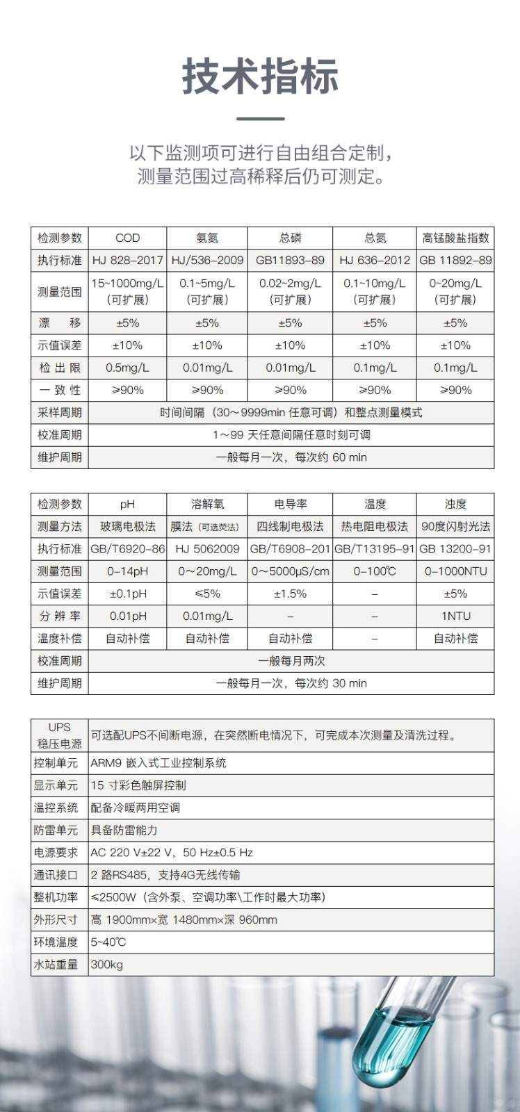 符合地表水在線自動監測要求,包含采配水系統、檢測單元(COD、氨氮、總磷、總氮、?錳酸鹽指數、常規五參數)、質量控制單元、輔助單元 (廢液收集、防雷、空調等)。